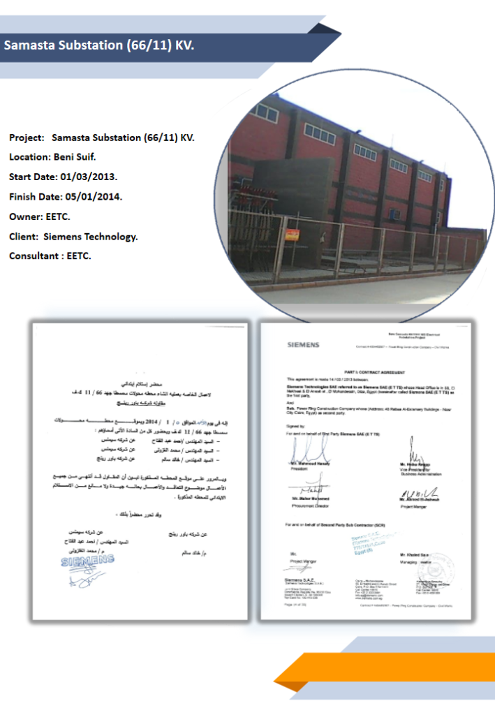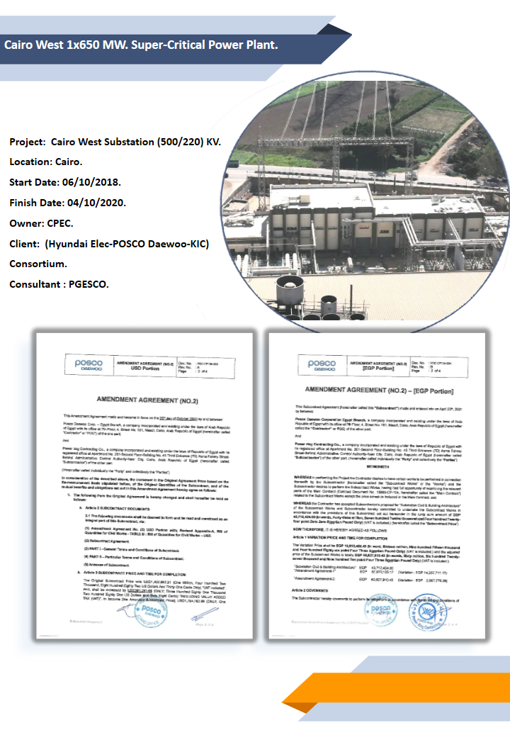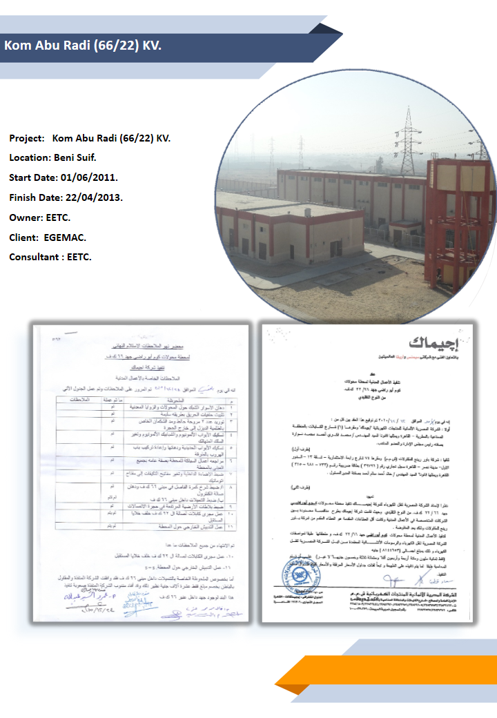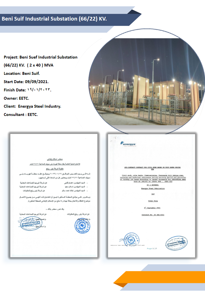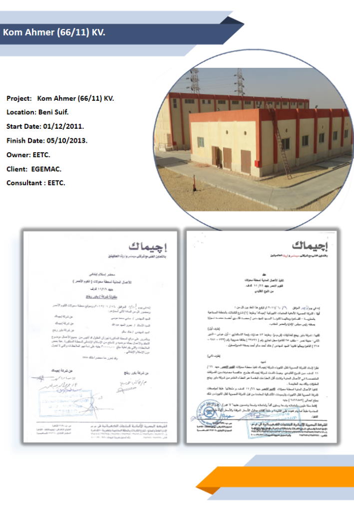 محطة توليد الكهرباء و محطة فرعية كهربائية مجال الخبرة غرب القاهرة 1x650 ميجاوات. محطة توليد الطاقة فائقة الأهمية. المشروع: محطة تحويلات غرب القاهرة (500/220) ك.ف.الموقع: القاهرة.تاريخ البدء: 06/10/2018.تاريخ الانتهاء: 04/10/2020.المالك: CPEC.العميل: اتحاد (Hyundai Elec-POSCO Daewoo-KIC).الاستشاري : بيجيسكو. جنوب حلوان 3x650 ميجاوات. محطة توليد الطاقة فائقة الأهمية. المشروع: محطة تحويل جنوب حلوان (500) ك.ف.الموقع: بني السويف.تاريخ البدء: 22/11/2015.تاريخ الانتهاء: 30/01/2017.المالك: UEEPC.العميل: ALSTOM Grid.الاستشاري : بيجيسكو. قناة السويس الحرارية 1×650 ميجاوات. محطة توليد الطاقة فائقة الأهمية. المشروع: محطة فرعية جنوب حلوان (500) ك.ف.الموقع: بني السويف.تاريخ البدء: 22/11/2015.تاريخ الانتهاء: 30/01/2017.المالك: UEEPC.العميل: ALSTOM Grid.الاستشاري : بيجيسكو. السويس 3x 167MVA، 500/220/11kV امتداد AIS SS. المشروع: توسعة محطة كهرباء السويس 3× 167 م.ف.أ، 500/220/11 ك.ف.الموقع: السويس.تاريخ البدء: 01/10/2022.تاريخ الانتهاء: 15/12/2023.المالك: EETC.العميل: شركة Siemens Energy.الاستشاري : الشركة المصرية لنقل الكهرباء. محطة تحويلات بني سويف الصناعية (22/66) ك.ف. المشروع: محطة فرعية صناعية بني السويف جهد (66/22) ك.ف. ( 2 × 40 ) ميجا فولت أمبيرالموقع: بني السويف.تاريخ البدء: 09/09/2021.تاريخ الانتهاء: 19/01/2023.المالك: EETC.العميل: Energya صناعة الصلب.الاستشاري : الشركة المصرية لنقل الكهرباء. محطة تحويلات حديد عز (220/30) ك.ف. المشروع: العز– محطة التحويلات الفولاذية (220/30) ك.ف. الموقع: العين السخنة-السويس.تاريخ البدء: 10/08/2021.تاريخ الانتهاء: 27/11/2022.المالك: العز مصنع الصلب.العميل: شركة Siemens Energy.الاستشاري: شاكر. محطة تحويل بشاير الخير (3,5) (66/11) ك.ف. المشروع: بشاير منطقة الخير (3,5) محطة فرعية (66/11) ك.ف.الموقع: الإسكندرية.تاريخ البدء: 50/08/2020.تاريخ الانتهاء: 01/09/2021.المالك: EETC.العميل: شركة Siemens Energy.الاستشاري : الشركة المصرية لنقل الكهرباء. محطة تحويل سمنود (11/66) ك.ف. المشروع: سمنود محطة فرعية (66/11) ك.ف.الموقع: AL-الغربية.تاريخ البدء: 07/03/2019.تاريخ الانتهاء: 20/02/2020.المالك: EETC.العميل: EGEMAC.الاستشاري : الشركة المصرية لنقل الكهرباء. محطة تحويلات اولاد صقر (66/11) ك.ف. المشروع: أولاد صقر محطة فرعية (66/11) ك.ف.الموقع: الشرقية.تاريخ البدء: 01/09/2017.تاريخ الانتهاء: 09/12/2020.المالك: EETC.العميل: EGEMAC.الاستشاري : الشركة المصرية لنقل الكهرباء. محطة تحويل سمسطا (66/11) ك.ف. المشروع: سمسطا محطة فرعية (66/11) ك.ف.الموقع: بني السويف.تاريخ البدء: 01/03/2013.تاريخ الانتهاء: 05/01/2014.المالك: EETC.العميل: شركة Siemens Technology.الاستشاري : الشركة المصرية لنقل الكهرباء. محطة تحويلية صورية جديدة (66/11) ك.ف. المشروع: محطة فرعية صورية جديدة (66/11) كيلو فولت.الموقع: الوادي الجديد.تاريخ البدء: 08/05/2012.تاريخ الانتهاء: 23/09/2013.المالك: EETC.العميل: A.B.B.الاستشاري : الشركة المصرية لنقل الكهرباء. محطة تحويل أسيوط (66/11) ك.ف. المشروع: أسيوط محطة فرعية (66/11) ك.ف.الموقع: أسيوط.تاريخ البدء: 01/09/2011.تاريخ الانتهاء: 12/01/2013.المالك: EETC.العميل: A.B.B.الاستشاري : الشركة المصرية لنقل الكهرباء. كوم أبو راضي (22/66) ك.ف. المشروع: كوم أبو راضي (22/66) كيلو فولت.الموقع: بني السويف.تاريخ البدء: 01/06/2011.تاريخ الانتهاء: 22/04/2013.المالك: EETC.العميل: EGEMAC.الاستشاري : الشركة المصرية لنقل الكهرباء. كوم الأحمر (66/11) ك.ف. المشروع: كوم الأحمر (11/66) كيلو فولت.الموقع: بني السويف.تاريخ البدء: 01/12/2011.تاريخ الانتهاء: 05/10/2013.المالك: EETC.العميل: EGEMAC.الاستشاري : الشركة المصرية لنقل الكهرباء.
