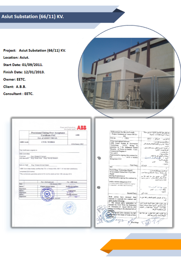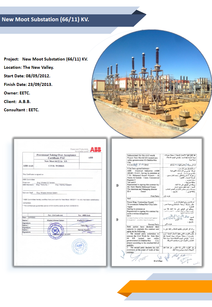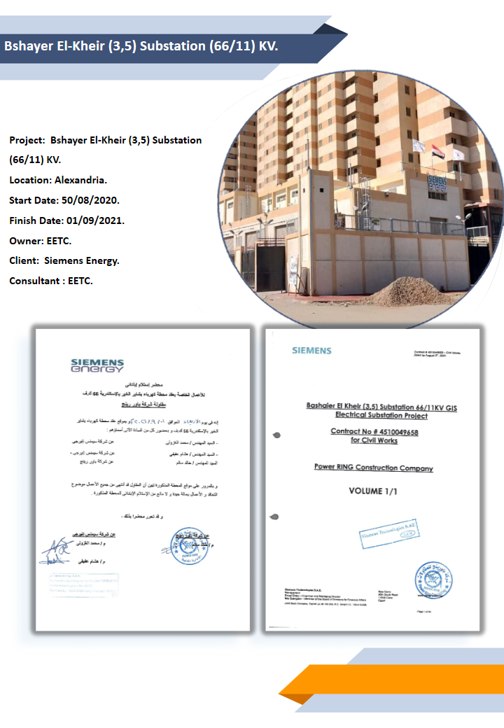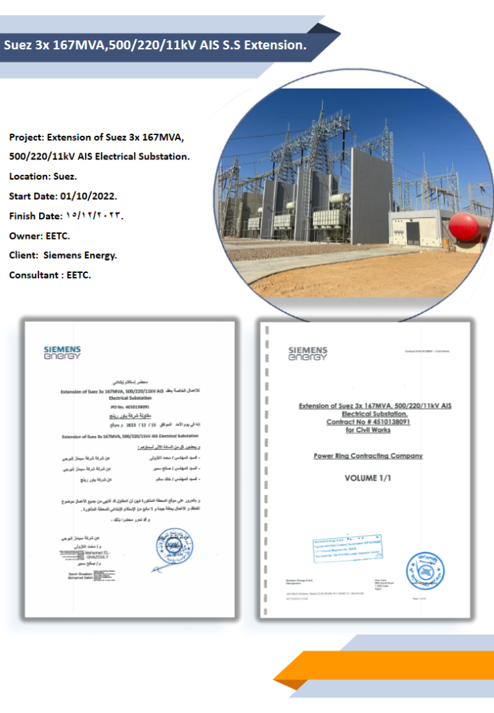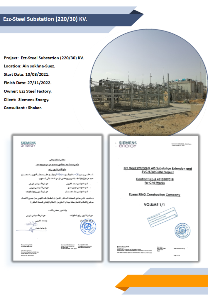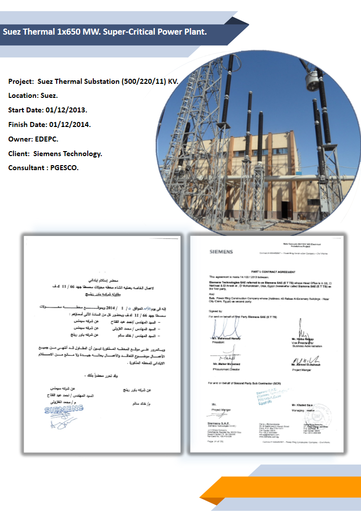 محطة توليد الكهرباء و محطة فرعية كهربائية مجال الخبرة غرب القاهرة 1x650 ميجاوات. محطة توليد الطاقة فائقة الأهمية. المشروع: محطة تحويلات غرب القاهرة (500/220) ك.ف.الموقع: القاهرة.تاريخ البدء: 06/10/2018.تاريخ الانتهاء: 04/10/2020.المالك: CPEC.العميل: اتحاد (Hyundai Elec-POSCO Daewoo-KIC).الاستشاري : بيجيسكو. جنوب حلوان 3x650 ميجاوات. محطة توليد الطاقة فائقة الأهمية. المشروع: محطة تحويل جنوب حلوان (500) ك.ف.الموقع: بني السويف.تاريخ البدء: 22/11/2015.تاريخ الانتهاء: 30/01/2017.المالك: UEEPC.العميل: ALSTOM Grid.الاستشاري : بيجيسكو. قناة السويس الحرارية 1×650 ميجاوات. محطة توليد الطاقة فائقة الأهمية. المشروع: محطة فرعية جنوب حلوان (500) ك.ف.الموقع: بني السويف.تاريخ البدء: 22/11/2015.تاريخ الانتهاء: 30/01/2017.المالك: UEEPC.العميل: ALSTOM Grid.الاستشاري : بيجيسكو. السويس 3x 167MVA، 500/220/11kV امتداد AIS SS. المشروع: توسعة محطة كهرباء السويس 3× 167 م.ف.أ، 500/220/11 ك.ف.الموقع: السويس.تاريخ البدء: 01/10/2022.تاريخ الانتهاء: 15/12/2023.المالك: EETC.العميل: شركة Siemens Energy.الاستشاري : الشركة المصرية لنقل الكهرباء. محطة تحويلات بني سويف الصناعية (22/66) ك.ف. المشروع: محطة فرعية صناعية بني السويف جهد (66/22) ك.ف. ( 2 × 40 ) ميجا فولت أمبيرالموقع: بني السويف.تاريخ البدء: 09/09/2021.تاريخ الانتهاء: 19/01/2023.المالك: EETC.العميل: Energya صناعة الصلب.الاستشاري : الشركة المصرية لنقل الكهرباء. محطة تحويلات حديد عز (220/30) ك.ف. المشروع: العز– محطة التحويلات الفولاذية (220/30) ك.ف. الموقع: العين السخنة-السويس.تاريخ البدء: 10/08/2021.تاريخ الانتهاء: 27/11/2022.المالك: العز مصنع الصلب.العميل: شركة Siemens Energy.الاستشاري: شاكر. محطة تحويل بشاير الخير (3,5) (66/11) ك.ف. المشروع: بشاير منطقة الخير (3,5) محطة فرعية (66/11) ك.ف.الموقع: الإسكندرية.تاريخ البدء: 50/08/2020.تاريخ الانتهاء: 01/09/2021.المالك: EETC.العميل: شركة Siemens Energy.الاستشاري : الشركة المصرية لنقل الكهرباء. محطة تحويل سمنود (11/66) ك.ف. المشروع: سمنود محطة فرعية (66/11) ك.ف.الموقع: AL-الغربية.تاريخ البدء: 07/03/2019.تاريخ الانتهاء: 20/02/2020.المالك: EETC.العميل: EGEMAC.الاستشاري : الشركة المصرية لنقل الكهرباء. محطة تحويلات اولاد صقر (66/11) ك.ف. المشروع: أولاد صقر محطة فرعية (66/11) ك.ف.الموقع: الشرقية.تاريخ البدء: 01/09/2017.تاريخ الانتهاء: 09/12/2020.المالك: EETC.العميل: EGEMAC.الاستشاري : الشركة المصرية لنقل الكهرباء. محطة تحويل سمسطا (66/11) ك.ف. المشروع: سمسطا محطة فرعية (66/11) ك.ف.الموقع: بني السويف.تاريخ البدء: 01/03/2013.تاريخ الانتهاء: 05/01/2014.المالك: EETC.العميل: شركة Siemens Technology.الاستشاري : الشركة المصرية لنقل الكهرباء. محطة تحويلية صورية جديدة (66/11) ك.ف. المشروع: محطة فرعية صورية جديدة (66/11) كيلو فولت.الموقع: الوادي الجديد.تاريخ البدء: 08/05/2012.تاريخ الانتهاء: 23/09/2013.المالك: EETC.العميل: A.B.B.الاستشاري : الشركة المصرية لنقل الكهرباء. محطة تحويل أسيوط (66/11) ك.ف. المشروع: أسيوط محطة فرعية (66/11) ك.ف.الموقع: أسيوط.تاريخ البدء: 01/09/2011.تاريخ الانتهاء: 12/01/2013.المالك: EETC.العميل: A.B.B.الاستشاري : الشركة المصرية لنقل الكهرباء. كوم أبو راضي (22/66) ك.ف. المشروع: كوم أبو راضي (22/66) كيلو فولت.الموقع: بني السويف.تاريخ البدء: 01/06/2011.تاريخ الانتهاء: 22/04/2013.المالك: EETC.العميل: EGEMAC.الاستشاري : الشركة المصرية لنقل الكهرباء. كوم الأحمر (66/11) ك.ف. المشروع: كوم الأحمر (11/66) كيلو فولت.الموقع: بني السويف.تاريخ البدء: 01/12/2011.تاريخ الانتهاء: 05/10/2013.المالك: EETC.العميل: EGEMAC.الاستشاري : الشركة المصرية لنقل الكهرباء.