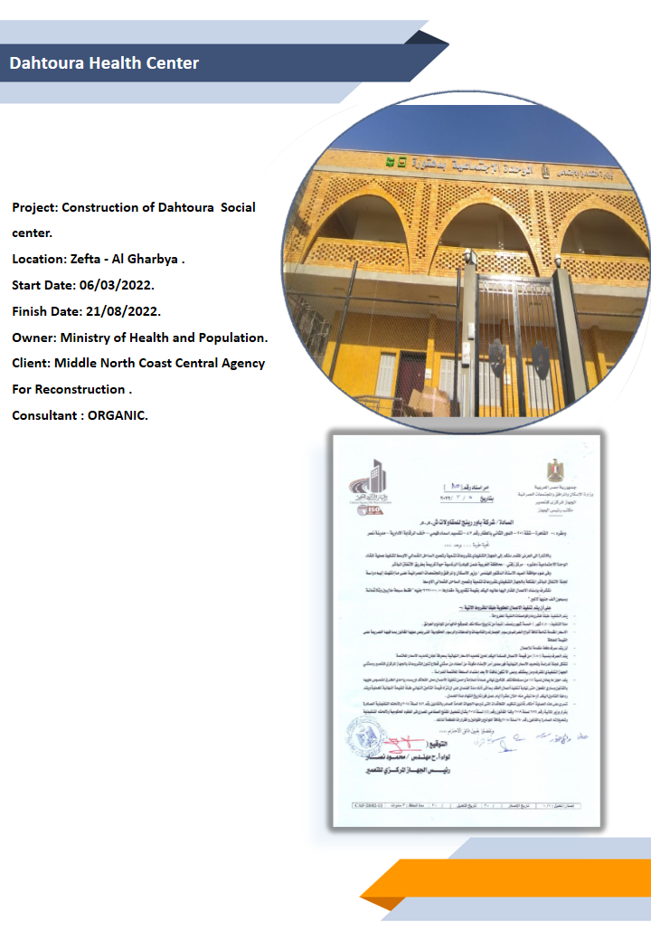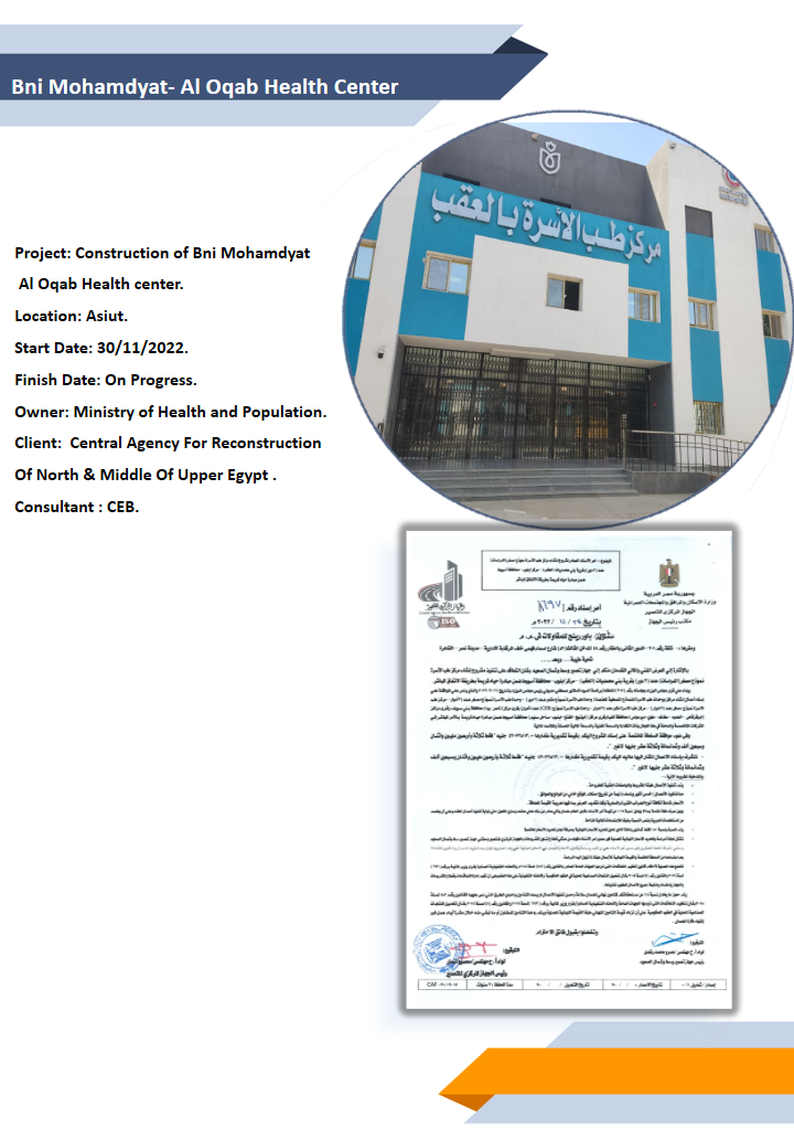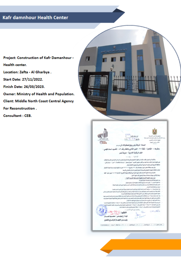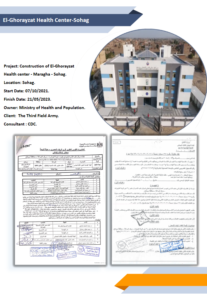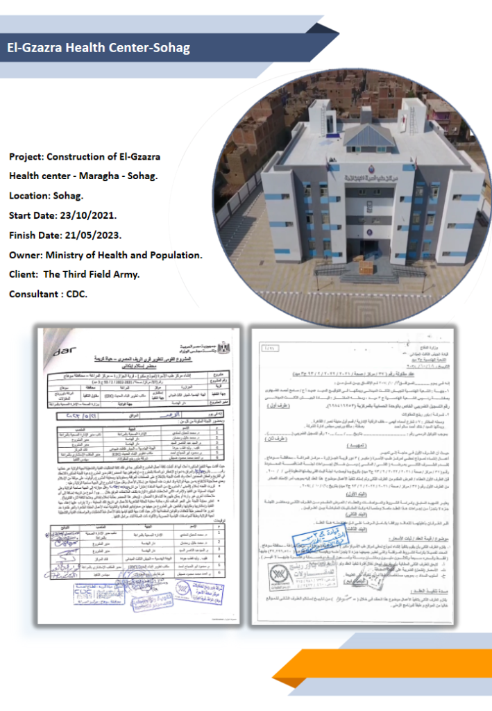 Health Care Centers Area of Expertise El-Ghorayzat Health Center-Sohag Project: Construction of El-Ghorayzat Health center – Maragha – Sohag.Location: Sohag.Start Date: 07/10/2021.Finish Date: 21/05/2023.Owner: Ministry of Health and Population.Client: The Third Field Army.Consultant : CDC. El-Gzazra Health Center-Sohag Project: Construction of El-GzazraHealth center – Maragha – Sohag.Location: Sohag.Start Date: 23/10/2021.Finish Date: 21/05/2023.Owner: Ministry of Health and Population.Client: The Third Field Army.Consultant : CDC. Bni Mohamdyat- Al Oqab Health Center Project: Construction of Bni Mohamdyat Al Oqab Health center.Location: Asiut.Start Date: 30/11/2022.Finish Date: On Progress.Owner: Ministry of Health and Population.Client: Central Agency For Reconstruction Of North & Middle Of Upper Egypt .Consultant : CEB. Kafr damnhour Health Center Project: Construction of Kafr Damanhour – Health center.Location: Zefta – Al Gharbya .Start Date: 27/11/2022.Finish Date: 26/03/2023.Owner: Ministry of Health and Population.Client: Middle North Coast Central Agency For Reconstruction .Consultant : CEB. Dahtoura Health Center Project: Construction of Dahtoura Social center.Location: Zefta – Al Gharbya .Start Date: 06/03/2022.Finish Date: 21/08/2022.Owner: Ministry of Health and Population.Client: Middle North Coast Central Agency For Reconstruction .Consultant : ORGANIC.