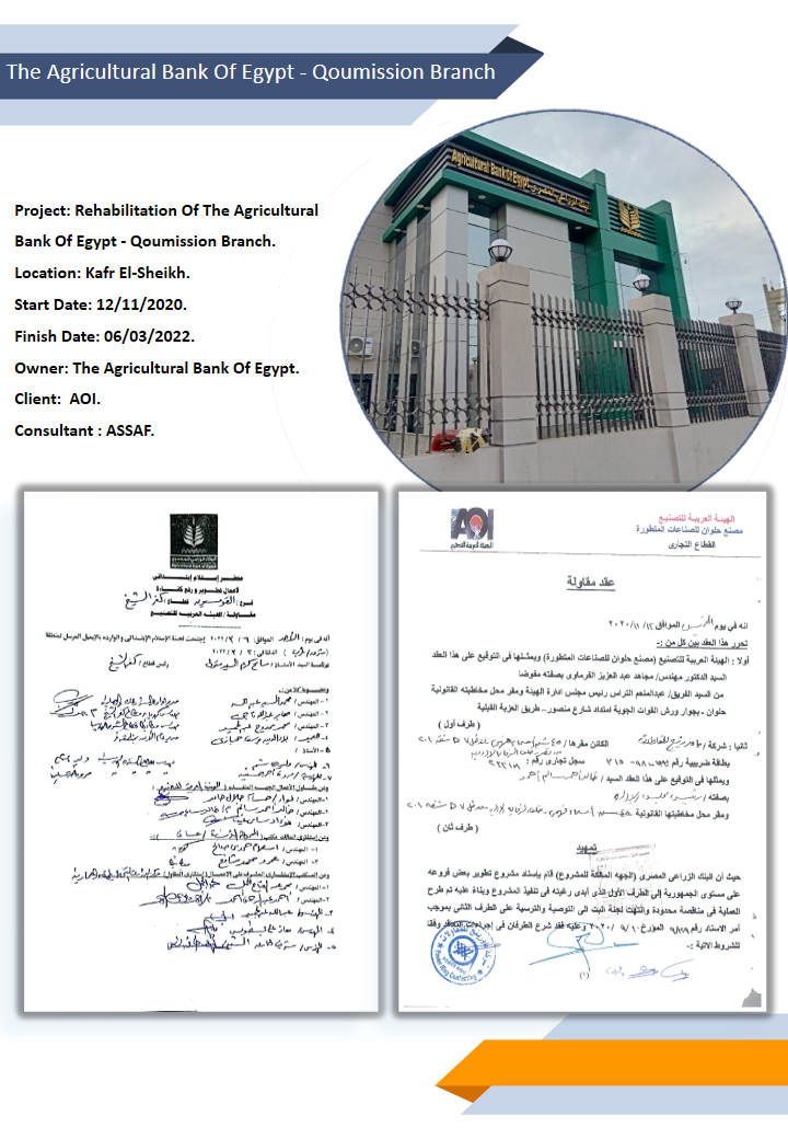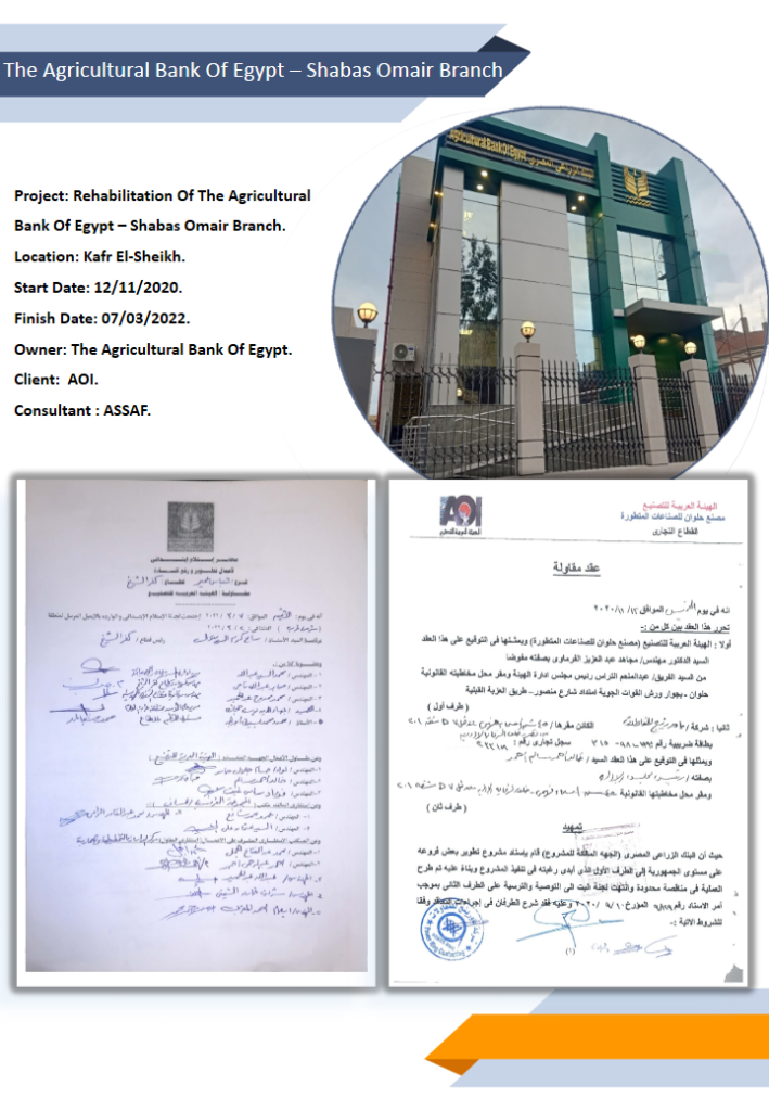 Work Categories Work Categories Over Head Transmission Lines READ MORE Power Plant & Electrical Substation READ MORE Car Services & Fuel Stations READ MORE Health Care Centers READ MORE Industerial Construction READ MORE General Constraction READ MORE Area of Expertise The Agricultural Bank Of Egypt - Qoumission Branch Project: Rehabilitation Of The Agricultural Bank Of Egypt – Qoumission Branch.Location: Kafr El-Sheikh.Start Date: 12/11/2020.Finish Date: 06/03/2022.Owner: The Agricultural Bank Of Egypt.Client: AOI.Consultant : ASSAF. The Agricultural Bank Of Egypt – Shabas Omair Branch Project: Rehabilitation Of The Agricultural Bank Of Egypt – Shabas Omair Branch.Location: Kafr El-Sheikh.Start Date: 12/11/2020.Finish Date: 07/03/2022.Owner: The Agricultural Bank Of Egypt.Client: AOI.Consultant : ASSAF.